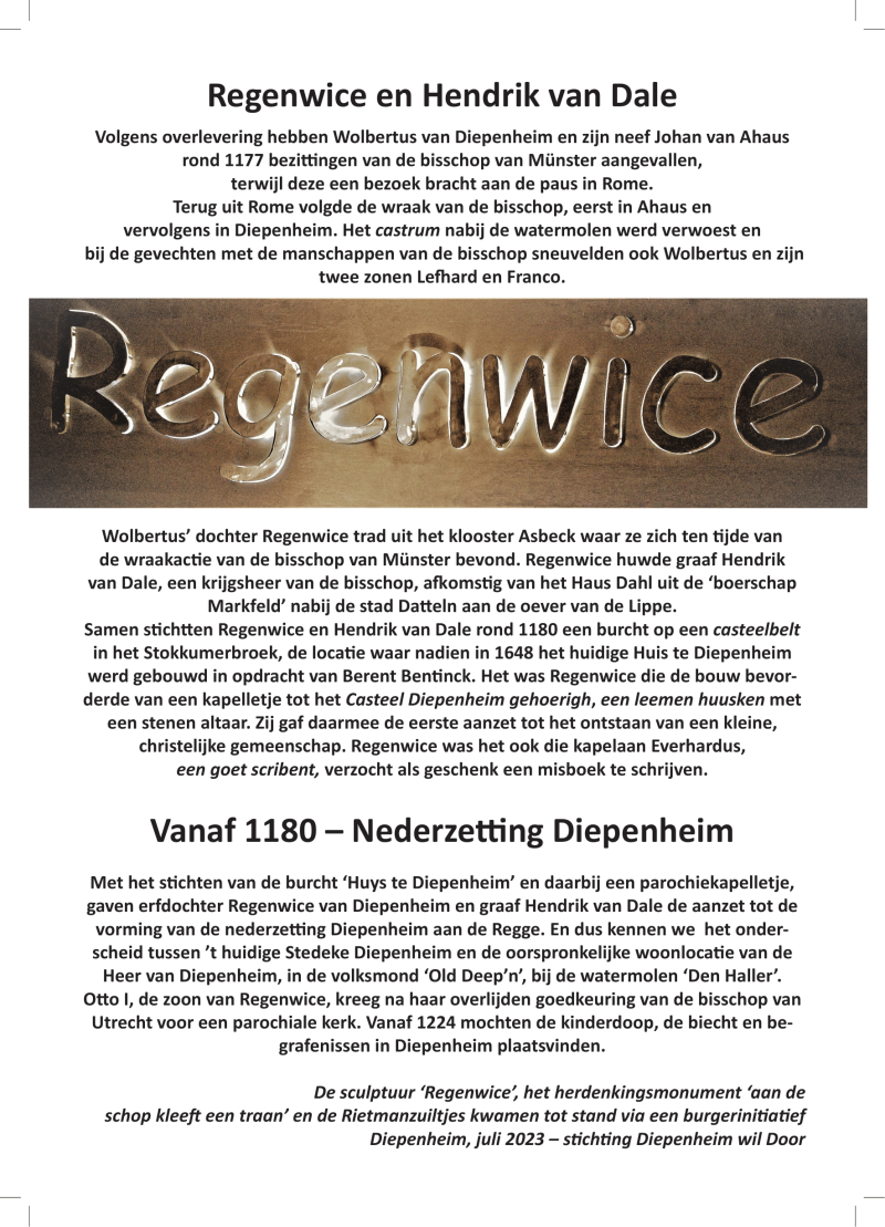 Op 10 oktober 2023 werd de sculptuur Regenwice, erfdochter Heerlijkheid Diepenheim, geplaatst op het Plein onder de Platanen